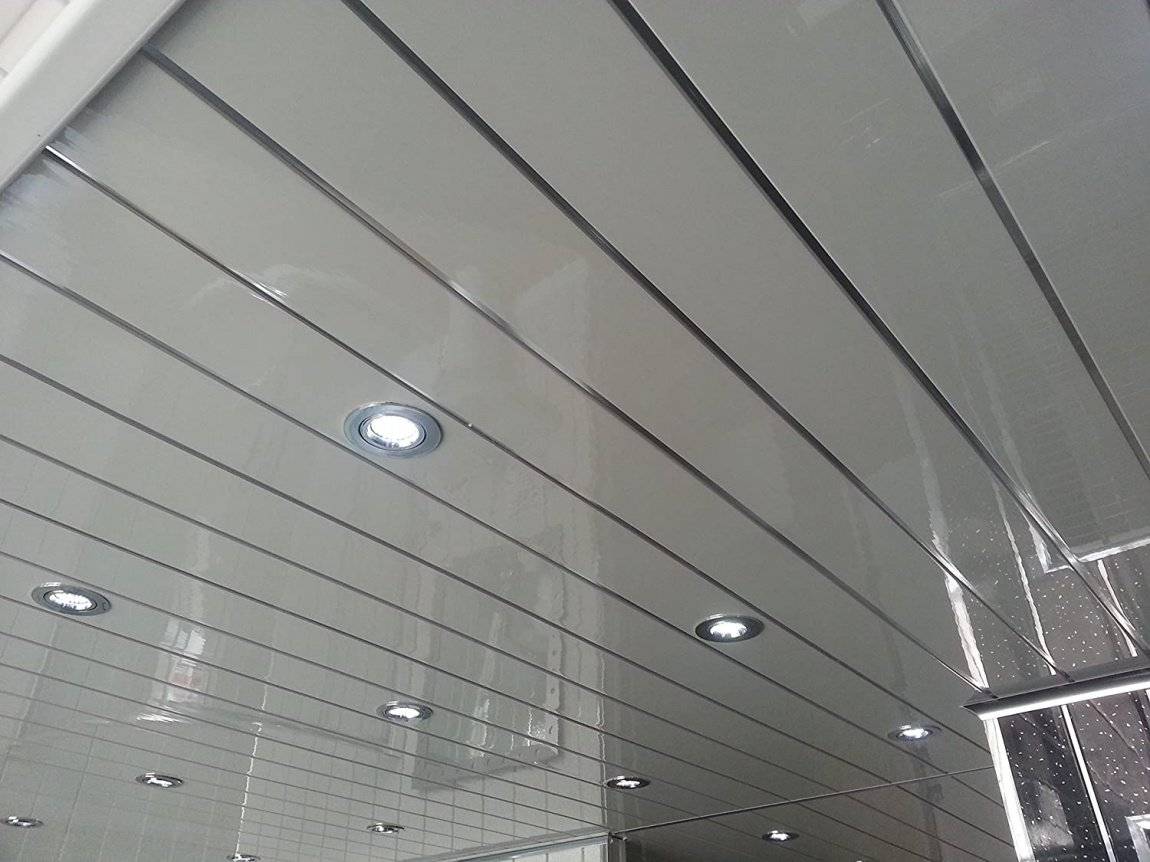 Представляет собой отдельные полосы, между которыми есть вогнутые узкие промежутки. Монтаж реечного потолка в ванной предполагает стыкование соседних панелей шип в паз, в результате получается герметичное сцепление.