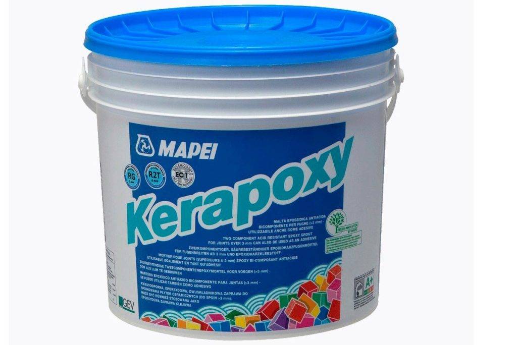 - KERAPOXY – двухкомпонентная эпоксидная затирка для швов от 3 мм. Может использоваться в качестве клея, устойчива к кислотам.
