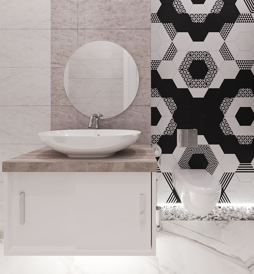 - Оригинальные керамические изделия способны полностью преобразить интерьер небольшого помещения, визуально расширив его габариты за счет цвета и рисунка.