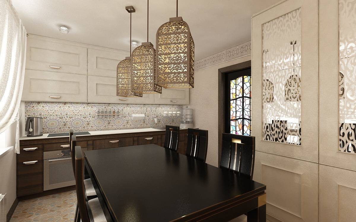 Первым делом выберем центральный светильник. Марокканский дизайн предполагает наличие шикарной габаритной люстры, которая станет центром внимания на вашей кухне. Классические сочетания — металл с прозрачным или мозаичным стеклом. Для традиционного азиатского направления лампы прячут за потолочные панели или используют светильники в виде квадратных фонариков.