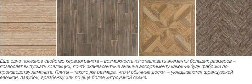 Структурированный керамогранит позволяет имитировать различные типы покрытий для пола. Обычно это различные вариации на тему натурального камня, но встречаются и более оригинальные варианты (ткань, кожа, паркет, ламинат).