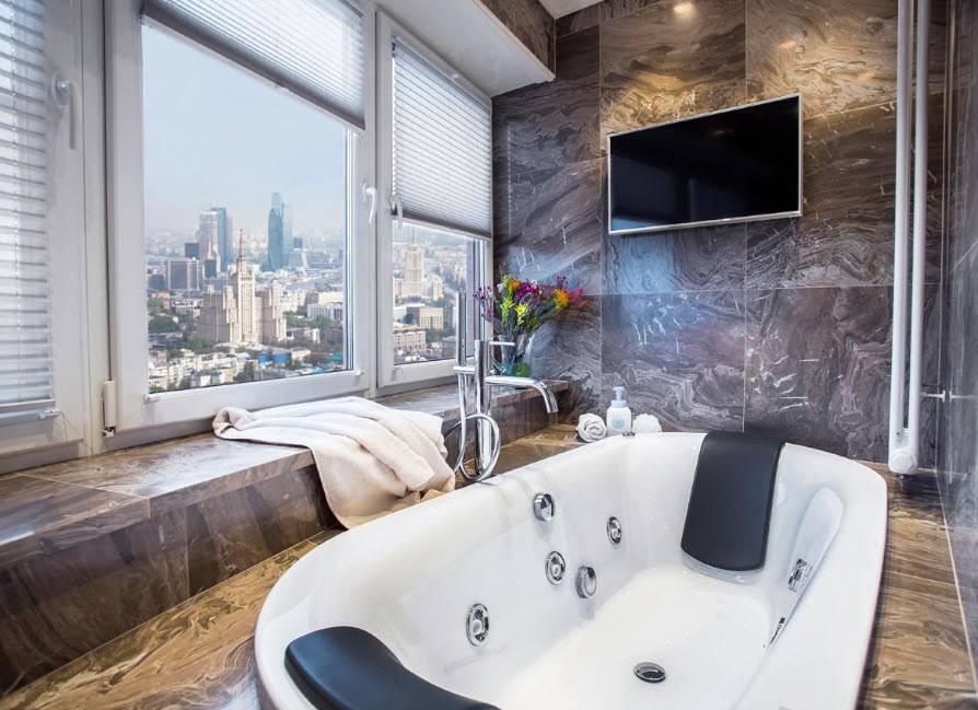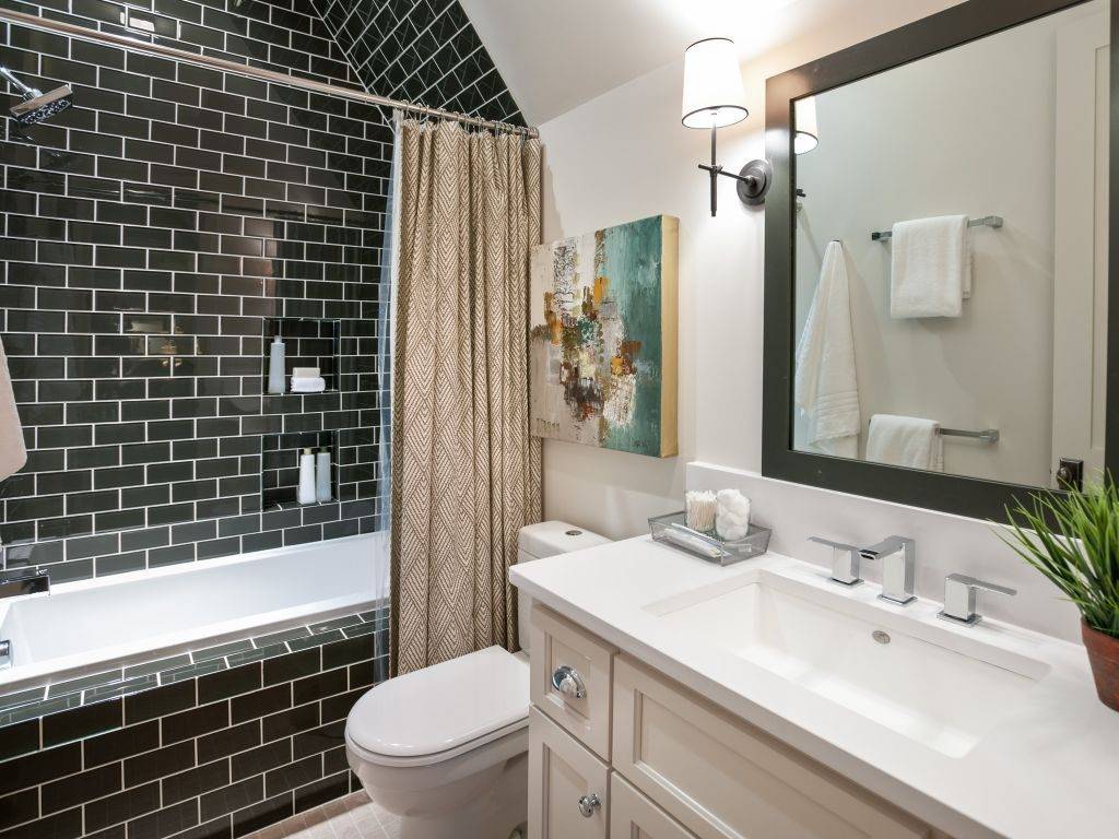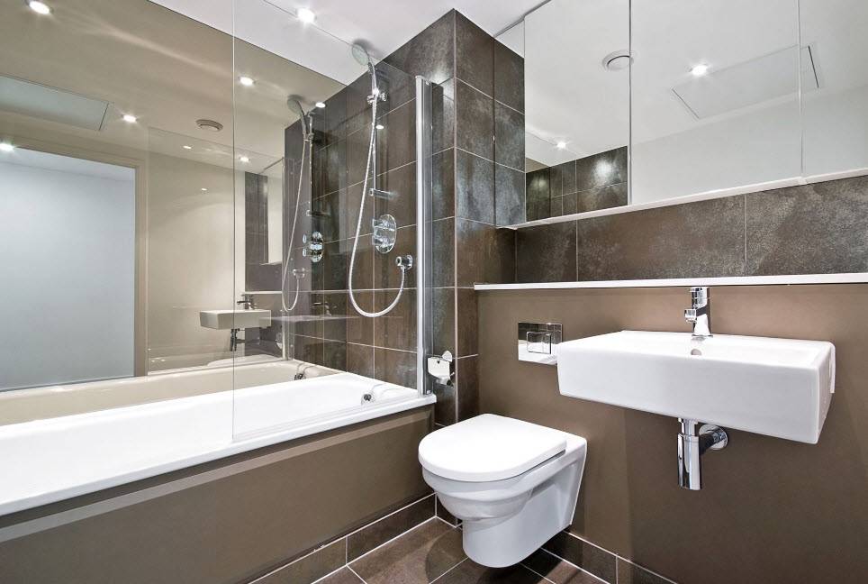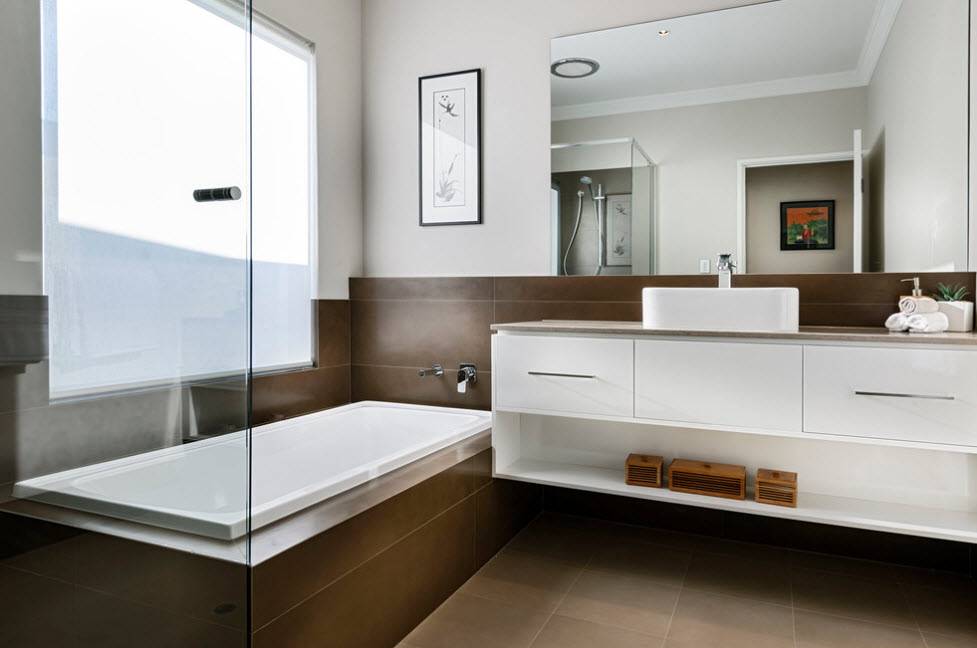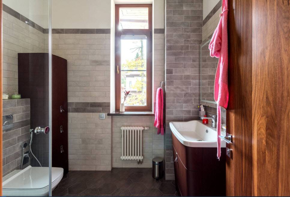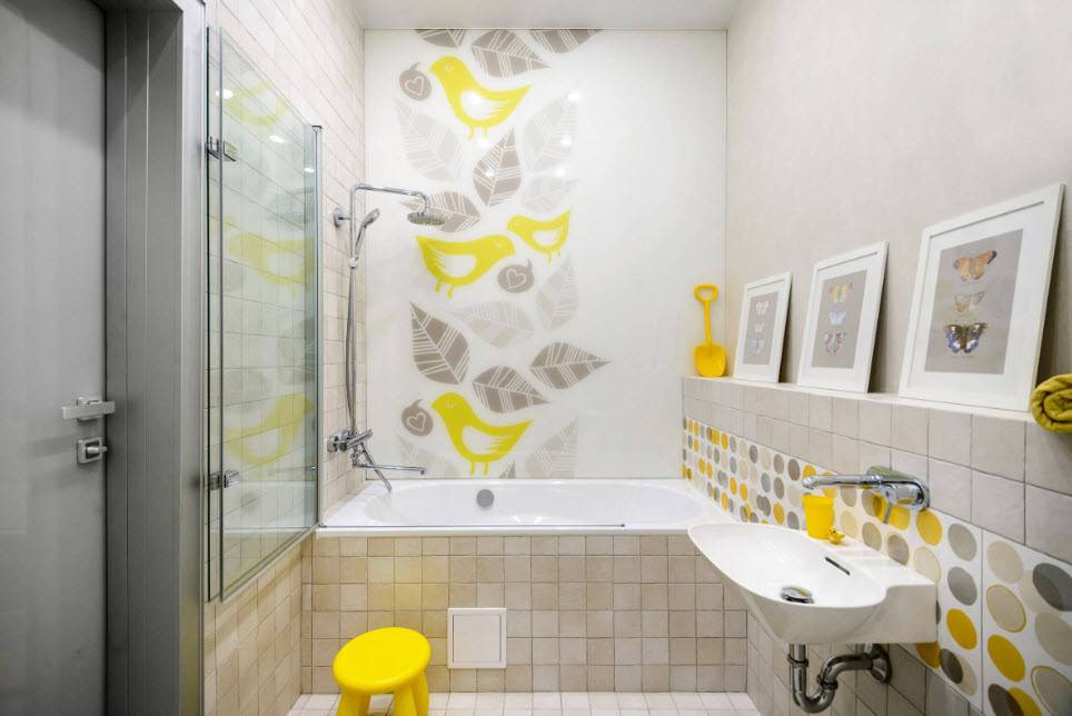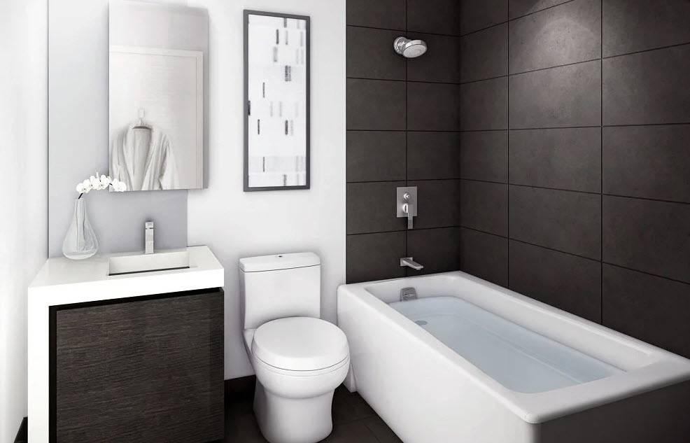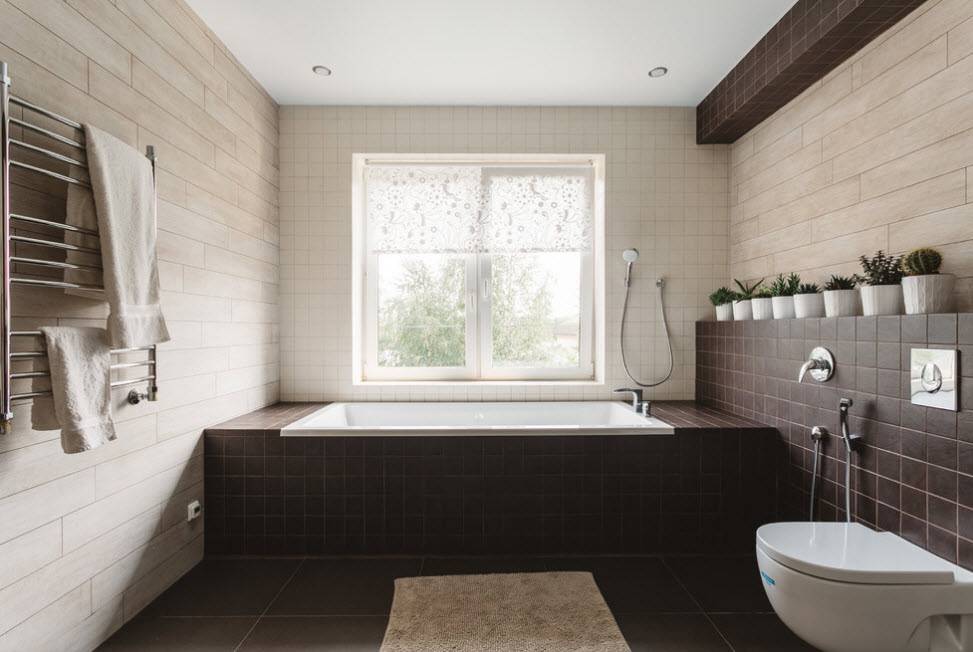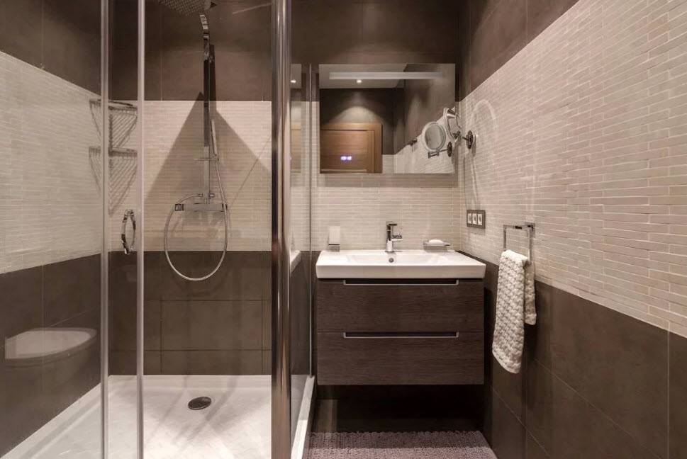 Визуально увеличить позволяют и темные оттенки, например, насыщенный серый цвет сделает комнату просторной, но многим может показаться мрачным. Предотвратить это можно, сделав яркие акценты при помощи элементов желтого или красного цвета. Также стильно выглядит комната, оформленная в коричневых тонах, которые сочетаются с желтым и белым кафелем.