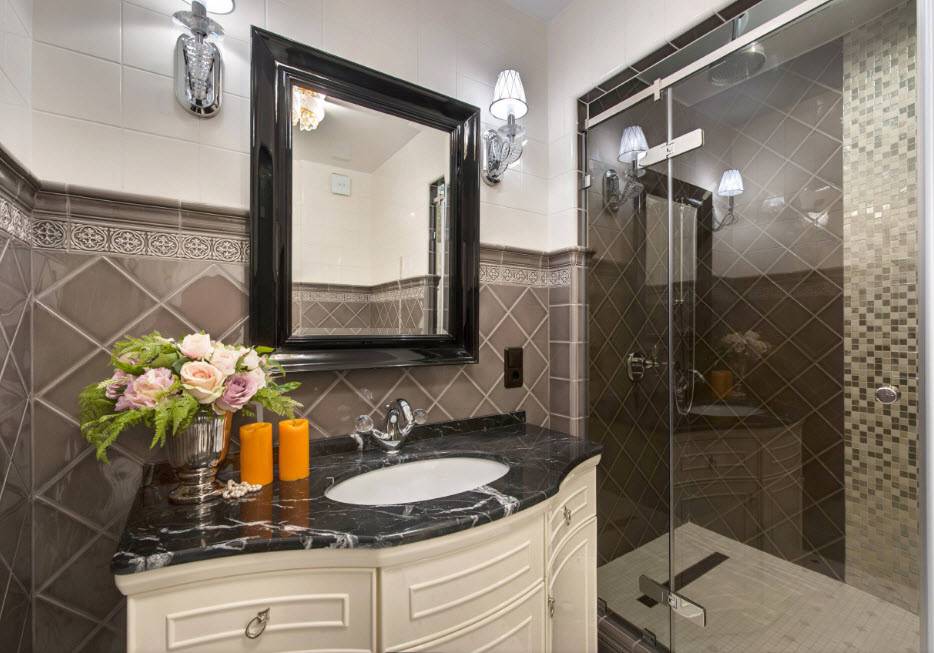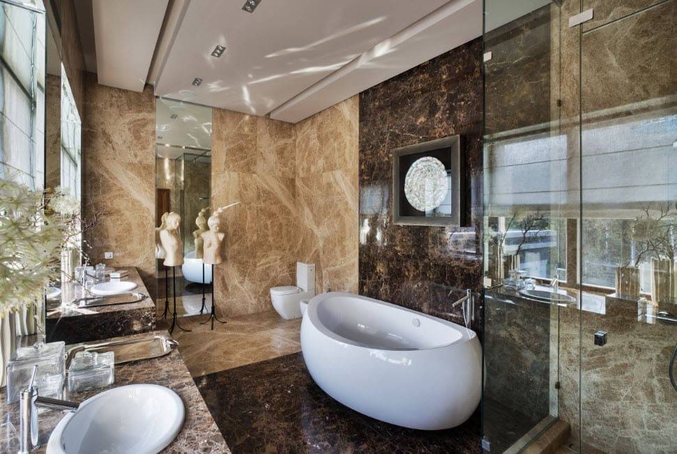 Такую плитку рекомендуется использовать для небольших ванных комнат. За счет того, что свет отражается от глазурованной поверхности, пространство зрительно расширяется. С глянцевым кафелем интерьер кажется ярче и «сочнее». Эффектно смотрится глянцевая плитка под мрамор черного и зеленого цветов.