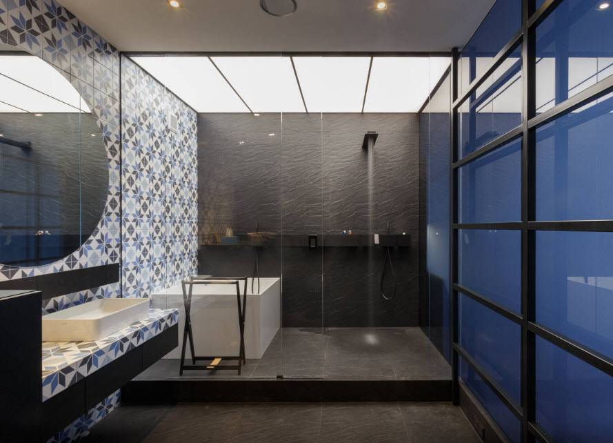 При выборе необычного дизайна плитки в ванной стоит рассмотреть керамогранит. Данный материал производится из специальных пород глин, кварцевого песка, цветных пигментов и шпата. Состав прессуется, тщательно просушивается и обжигается. Это вариант материала, который по составу напоминает фарфор, а по внешнему виду похож на камень. Преимуществом подобного материала считается стойкость к влажности. Его поверхность не впитывает воду. Также материал отличается устойчивостью к морозам. Его даже применяют для облицовки фасадов домов. Хотя керамогранит по текстуре напоминает камень, но более устойчивый к появлению трещин и различным повреждениям. Из-за своей прочности он применяется для облицовки полов.