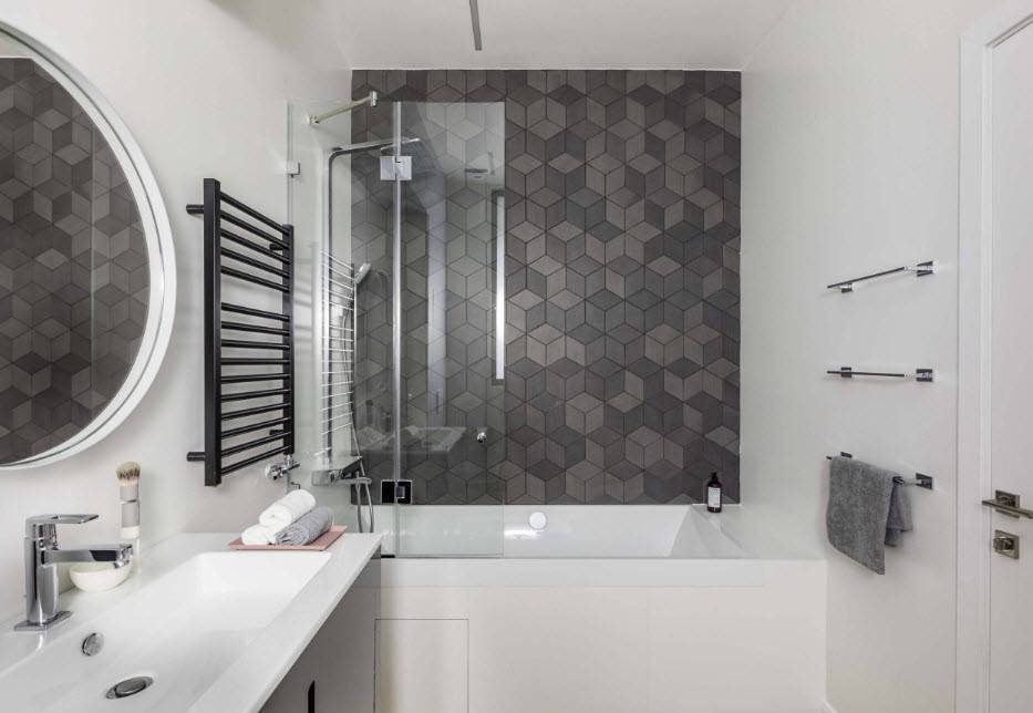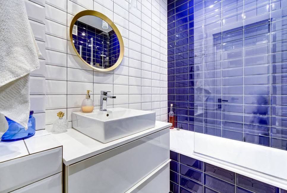 Дизайнеры применяют способы визуального разделения пространства, используя бордюр, узкий или широкий, яркий декор, который выделяется на фоне остальной плитки, разные способы укладки, прямой, диагональный, «елочкой», с перехлестом.