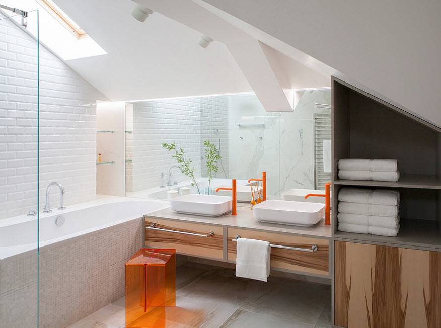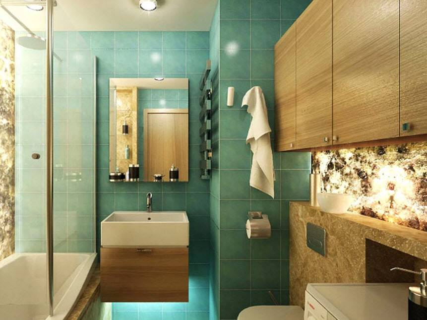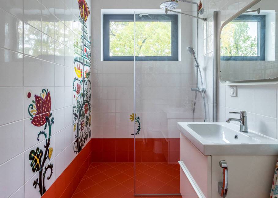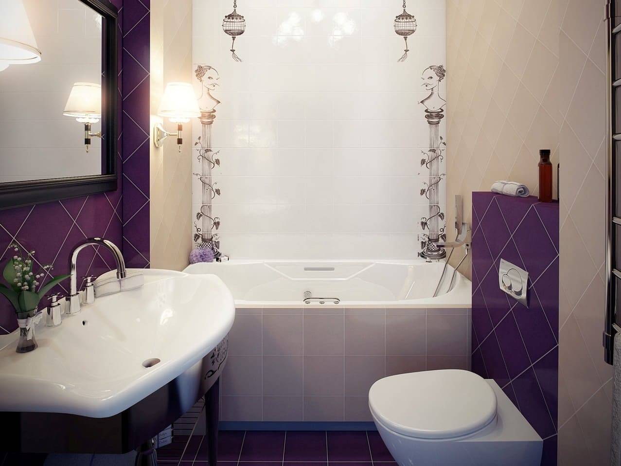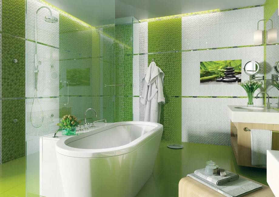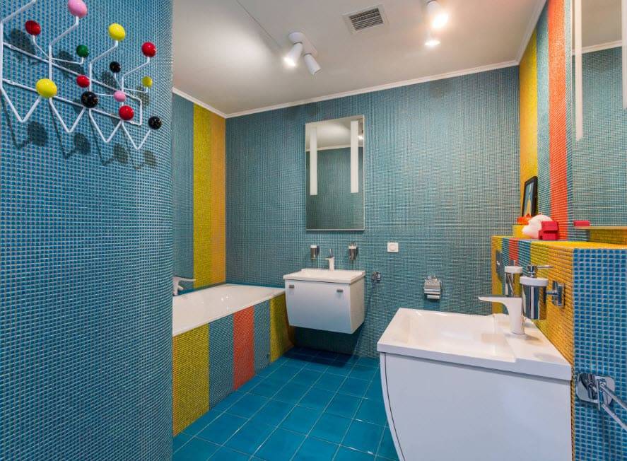 Также при ремонте ванной комнаты можно использовать яркие стены, ведь насыщенные оттенки создают всплеск эмоций, наполняя человека энергией и позитивом. Для этого лучше всего использовать зеленый, красный, оранжевый или фиолетовый, которые сочетаются с кафелем белого цвета. Оригинальным и современным решением станет использование мозаики, которое актуально для небольших комнат.
