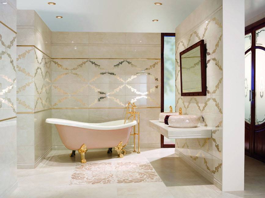 Размер крупной плитки составляет 25 х 40 см, как правило, ей оформляют пол. При облицовке крупной плиткой стен ванных комнат для достижения декоративного эффекта целесообразно использование композиции из плиток большого и среднего размеров.