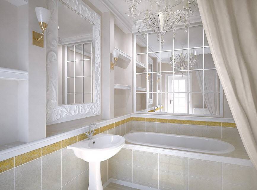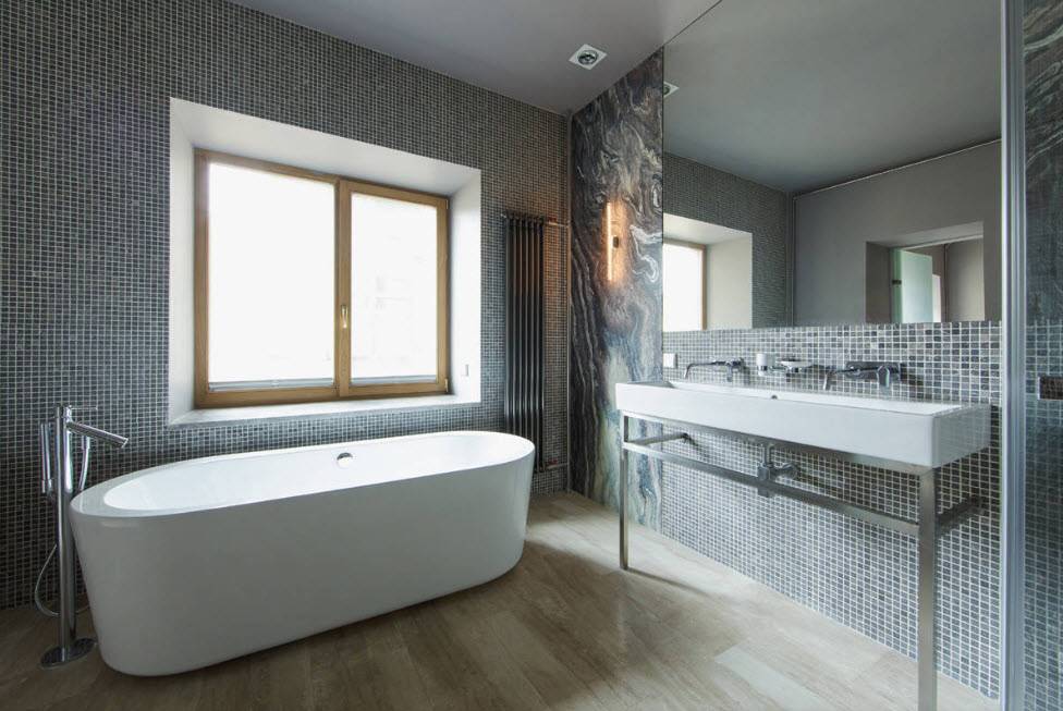 Коварство мелких фрагментов заключается в том, что мозаика оптически уменьшает пространство. Чтобы избежать этого эффекта при оформлении стен ванных комнат стоит применить композиционное сочетание мозаики с плиткой среднего размера.