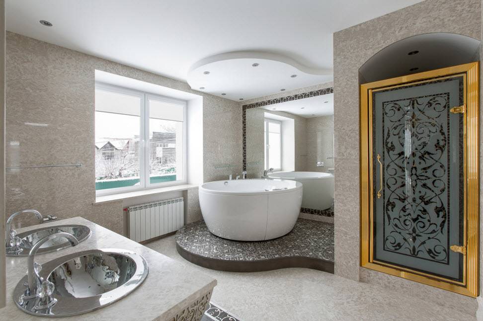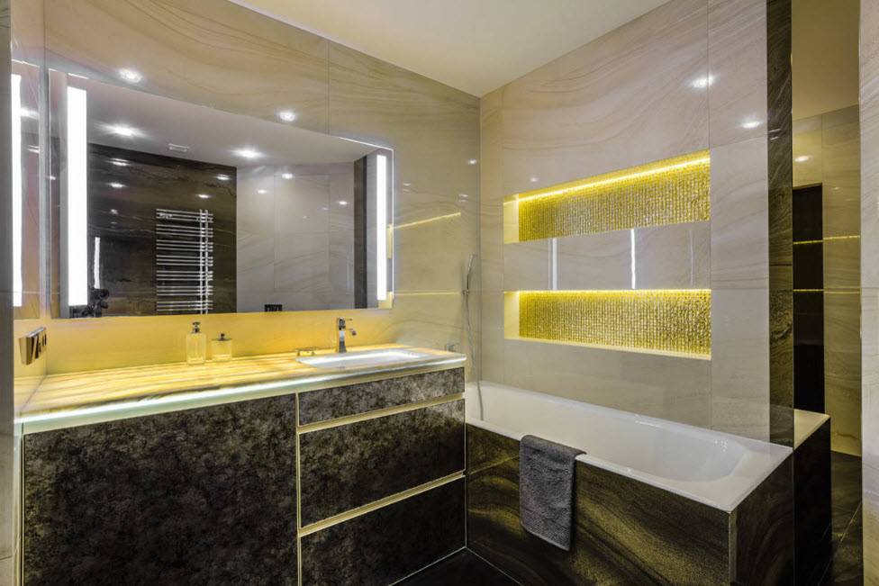 При отделке акцент можно сделать на нишах, красивому мозаичному оформлению короба ванной, настенному панно или авторских аксессуаров.