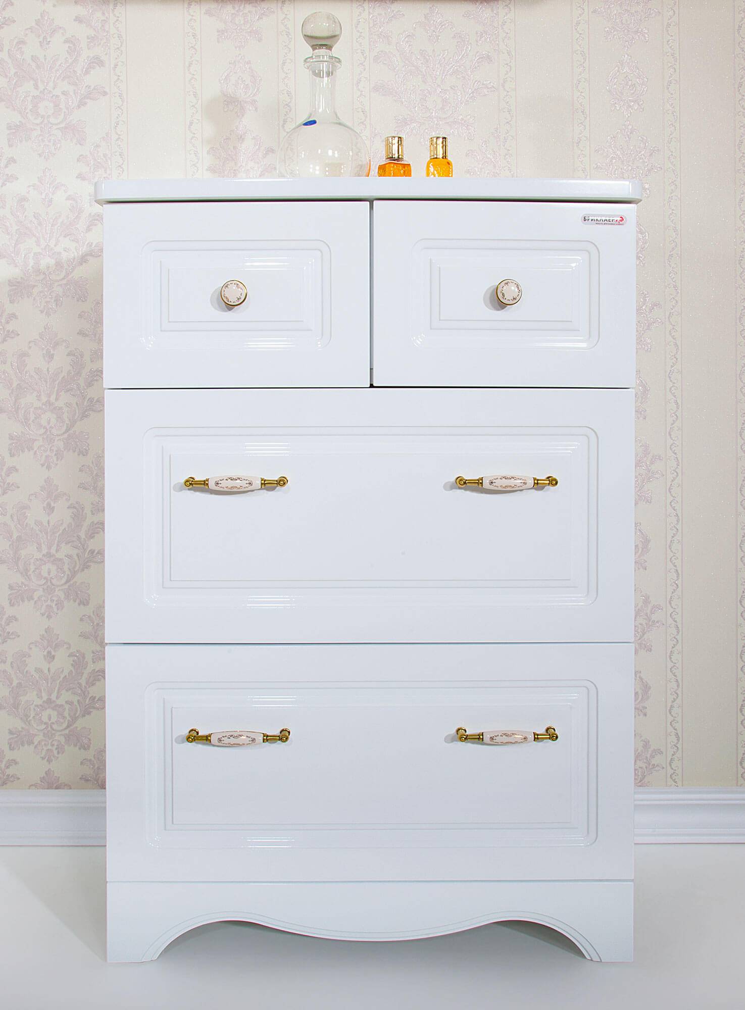 - комод в ванную комнату напольный – каркас изделия оснащается ножками или опорными элементами и устанавливается на пол. Если модель не под умывальник, ее можно переместить на другое место;