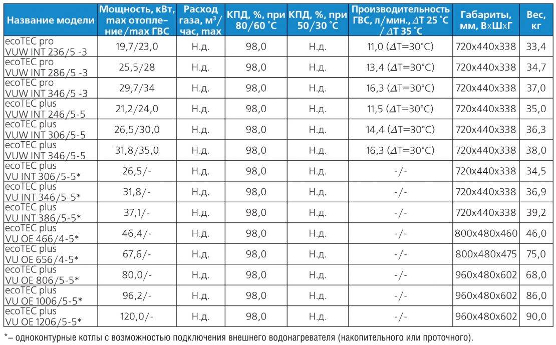 - 1. Vaillant eco TEC plus VU INT IV 346/5−5H — одноконтурный обогреватель от немецких производителей, который устанавливают на стену. Обладает коэффициентом полезного действия, превышающим 100%. Расход газа составляет 3,5 м³/час, мощность — 34,7 квт. Для изготовления теплообменника используют нержавеющую сталь, что позволяет увеличить срок службы агрегата.