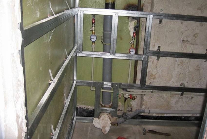 Совет. Во время сборки каркаса необходимо продумать возможность установки в будущем полочек, шкафчиков и прочих элементов интерьера ванной. Для этой цели в конструкцию в нужных местах вставляют дополнительные (возможно усиленные изнутри деревянным брусом) профиля.