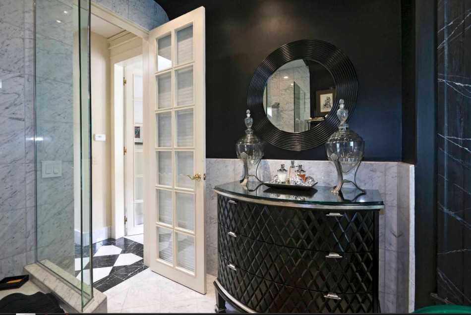 В неё с лёгкостью помещается большое джакузи, вся сантехника, шкафчики, туалет и биде. Такая комната хоть и теряет свой определённый уют, зато получает простор и не приходится решать дизайнерские головоломки касательно наиболее удачного размещения сантехники.