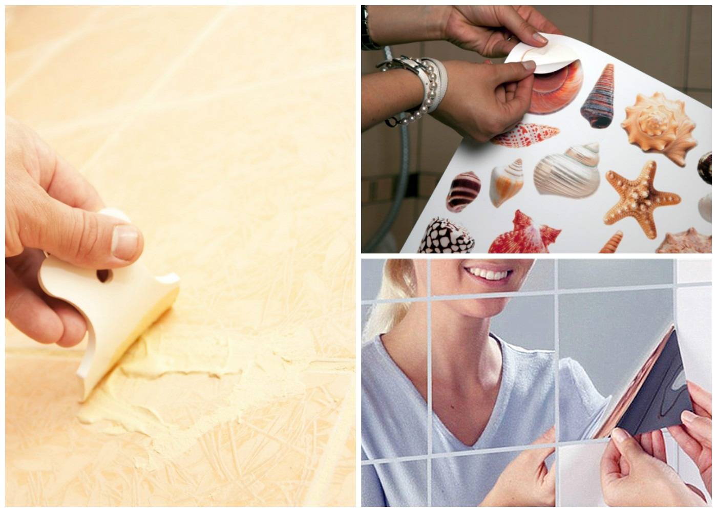 Другой вариант обновления облицовки наклейками — создание декоративных панно. Их размещают над раковиной или в центральной части стены. Можно купить готовое панно или собрать его из отдельных маленьких наклеек самостоятельно. Второй вариант более предпочтителен при создании больших композиций.