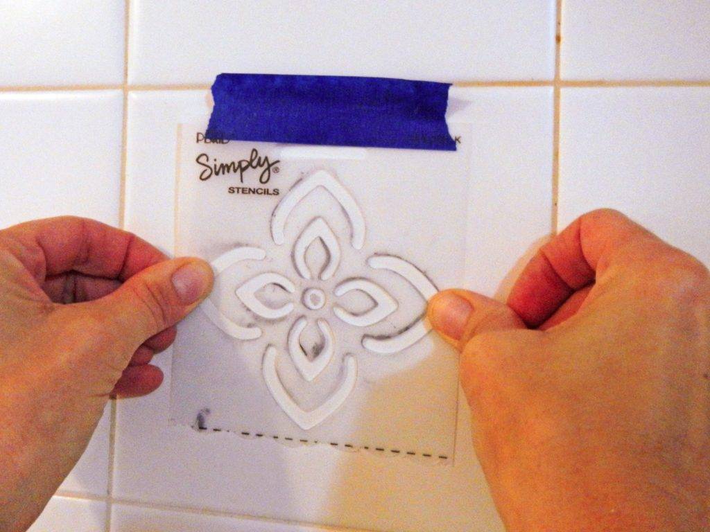 Чтобы выполнить узор на плитке, трафарет с помощью скотча фиксируют на нужном участке стены, а затем наносят краску валиком, кистью или распыляют ее из аэрозольного баллончика.