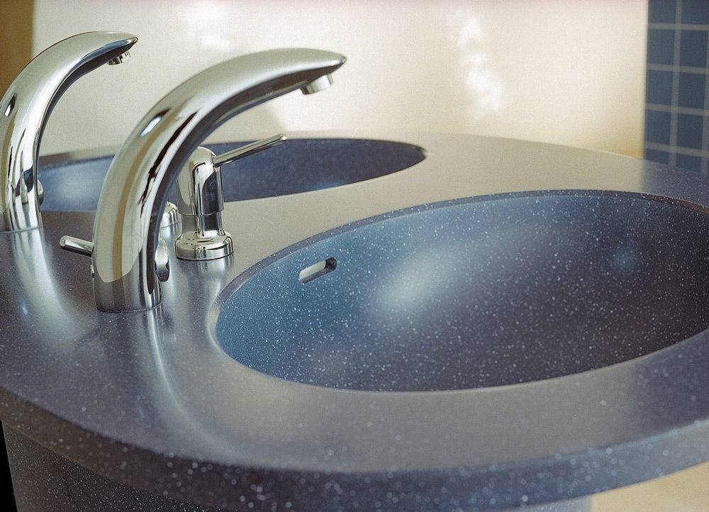 - Встраиваемые в столешницу раковины более сложны в установке, требующие определённого инструмента. Но проклеенные и зашлифованные стыки и зазоры не скапливают грязи. Столешницы с раковинами такого типа могут быть изготовлены на месте. Например, изготавливают железобетонную конструкцию и обклеивают её плиткой с последующей установкой и врезкой раковин.