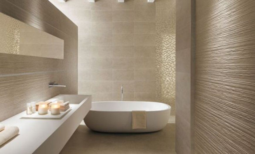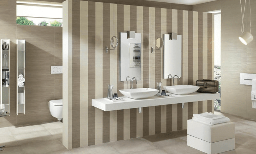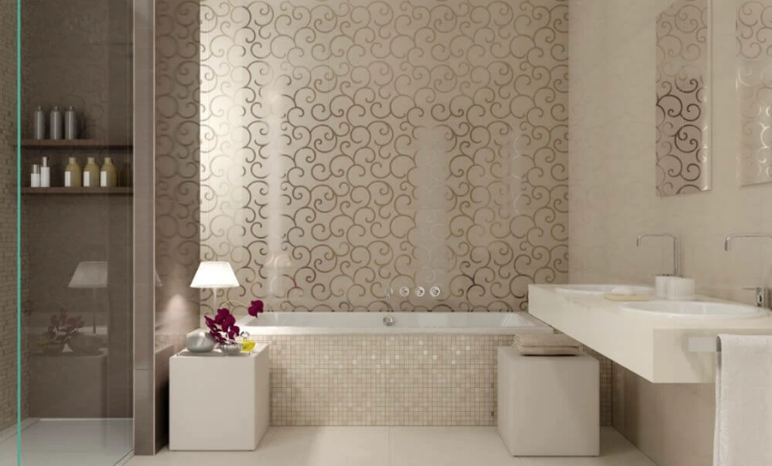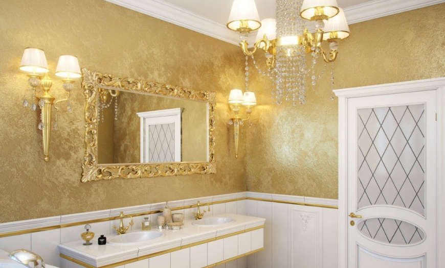 Основную часть комнаты лучше выполнить в одном из этих цветов, а детали и часть настенной плитки – в золотом.