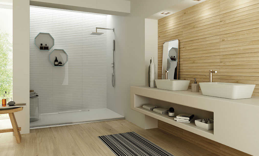 Натуральный материал привлекает экологической безопасностью. Для ванной дерево применялось редко. Это объясняется его способностью деформироваться и разрушаться при попадании капель. Можно использовать деревянные виды отделки, обладающие высокой плотностью. Это брус или рейки из древесины ироко, мербау, дуба, тика