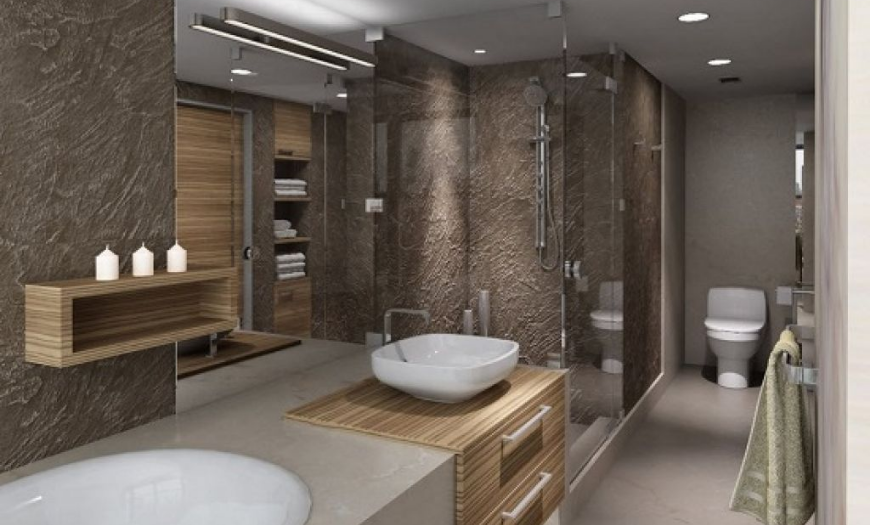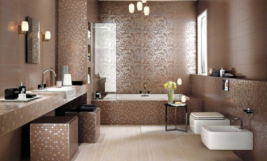Коричневый. Оформление ванны в этом цвете дает волю фантазии. Как минимум потому, что у коричневого много оттенков: бежевый, оливковый, шоколадный, глиняный и так далее, поэтому каждый выберет на свой вкус. Популярность этого цвета обусловлена актуальностью эко-стиля, потому что коричневый цвет символизирует натуральные материалы, например, дерево, которое сейчас так же популярно, как и камень. К тому же, в одном интерьере можно сочетать несколько разных оттенков, чтобы создать более интересный и сложный дизайн.