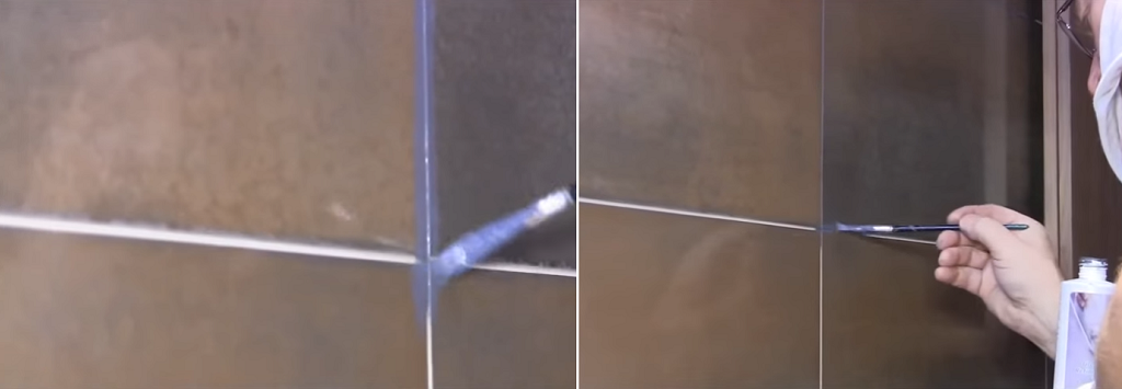 Более простой способ – использование водоэмульсионной краски. Покраска швов выполняется тонкой и мягкой кисточкой. Это средство надежно замаскирует поврежденную затирку.