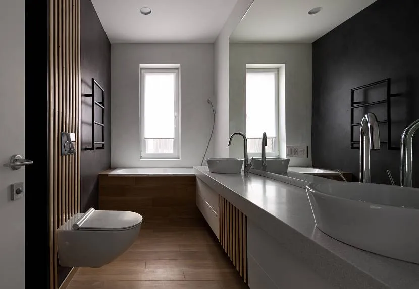 - Черно-белый. Контрастное сочетание универсально и позволит санузлу заиграть новыми красками.