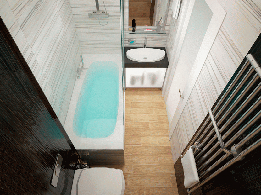 Дизайн длинной ванной с небольшой шириной предполагает установку сантехники вдоль стены. Однако можно, пожертвовав возможностью принимать ванну лежа, установить компактную сидячую модель вдоль узкой стены.