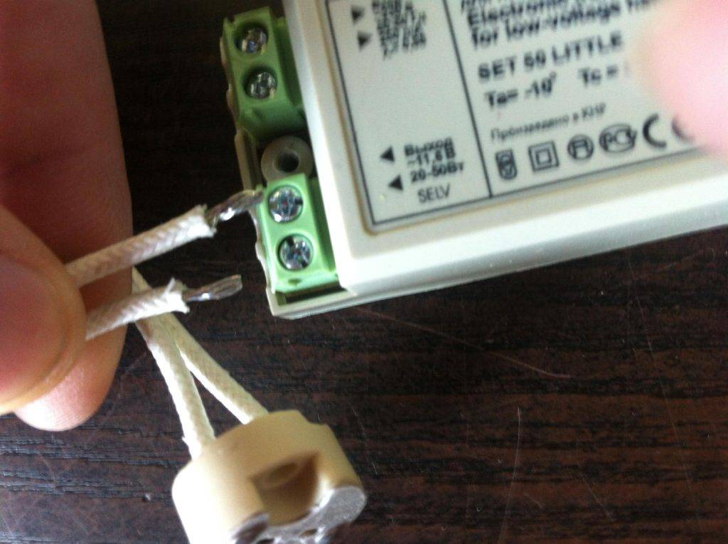 Петля из кабеля разрезается пополам, с проводов снимается защитная изоляция на 10 мм и они соединяются обратно посредством клеммника. Свободная оставшаяся клемма будет служить для подсоединения питающего кабеля с самой светоточки. Такой тип подключения именуют параллельным.