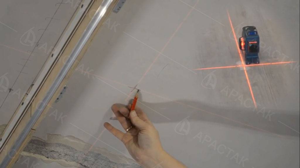 Вымеряется самое большое расстояние между нижним краем профиля и базовым потолком. Нужно это для того, чтобы отрезать перфорированную ленту необходимой длины.