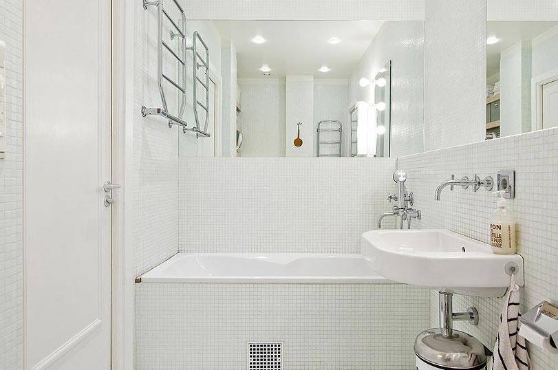 Белая мозаика – нестареющий классический вариант для оформления ванной комнаты. Её можно использовать в двух вариантах: