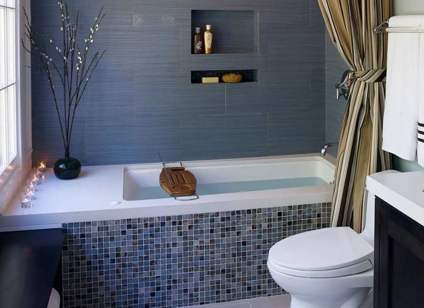 Отличным вариантом для оформления ванной станет стеклянная укладка плитки на ванну, которую представляет собой мозаичная плитка, позволяющая создать в помещении 3D-эффект и буквально оживить его.