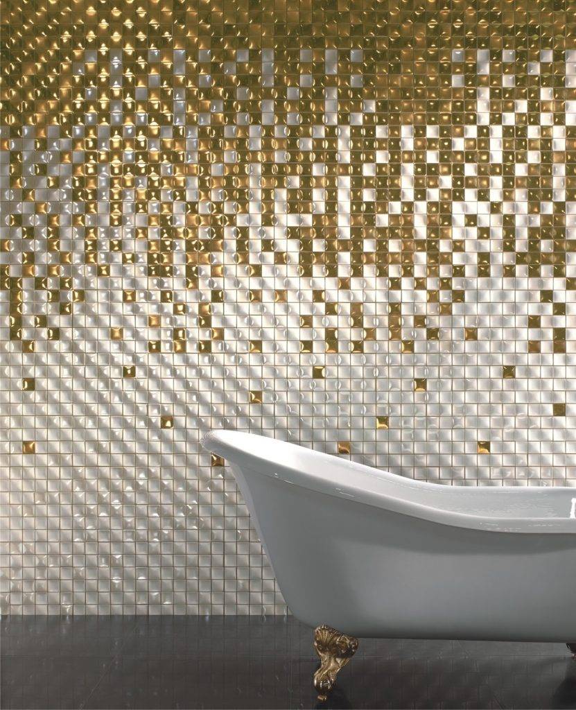 Металл. Данная мозаика в ванну станет неплохим дополнением для душевого помещения. Она смотрится весьма элегантно, стильно и современно. Фактически металлические изделия являются олицетворением новых дизайнерских решений. Однако это существенный плюс для материала, так и его минус, потому что он не подходит ко всем интерьерам. Плитка из металла оставляется матовой или полируется до зеркального блеска. В качестве сырья обычно используют алюминий, а также нержавеющую сталь, однако, имитировать верхний слой могут и другие металлы.