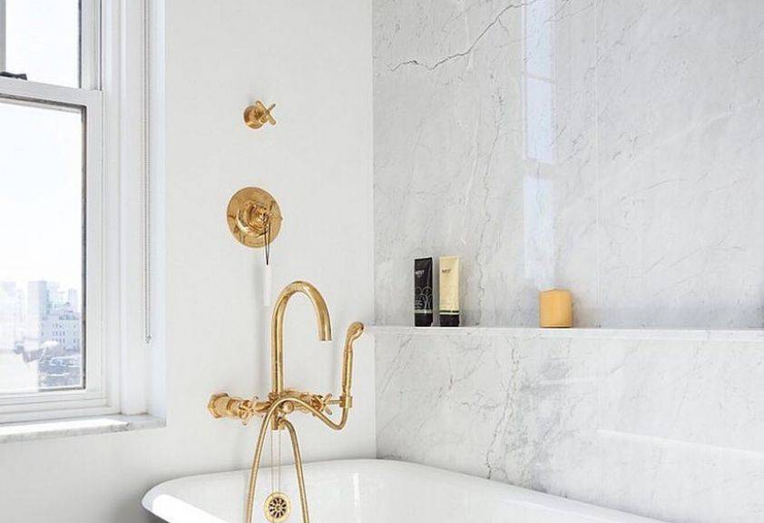 Для классики отделка ванной комнаты мраморной плиткой считается наилучшим вариантом. Можно отделать плитками не только стены, но и пол с потолком.
