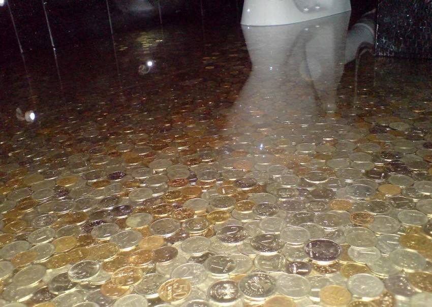 Рисунок на полу можно выложить из различных декоративных материалов, таких как засушенные цветы, листья, монеты, бусины, камушки, ракушки и т. д. Предметы хаотично выкладывают на основание и заливают слоем эпоксидной смолы. Все остальное оформление ванной комнаты (мебель, сантехника, отделка стен) выполняют так, чтобы по стилю оно сочеталось с получившимся изображением на полу.