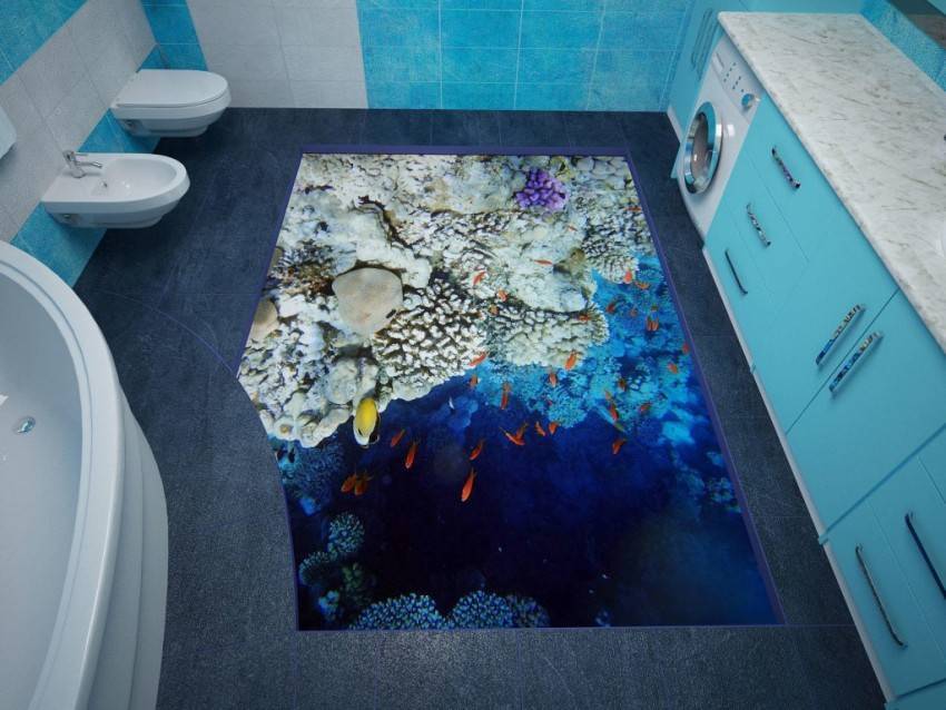 Для создания нужного эффекта может также использоваться 3d плитка, изготавливаемая с помощью микролинзовой технологии. На обычную кафельную плитку наносится рисунок, защищенный специальным прозрачным покрытием. Минус ее по сравнению с наливным полом в том, что такое покрытие имеет швы, в которых размножаются микробы. Полимерное покрытие представляет собой цельную поверхность, поэтому более гигиенично.