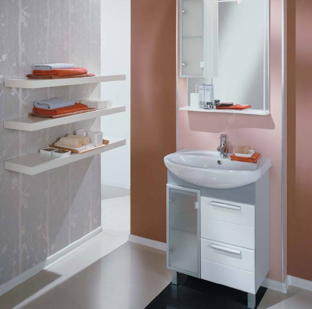 Для очень маленьких помещений предусмотрена установка комплекта, включающего – тумбочку, раковину и зеркало. Роль зеркала в некоторых моделях выполняет эргономичный шкафчик с зеркальной стенкой фасада, это позволяет более рационально использовать имеющееся пространство.