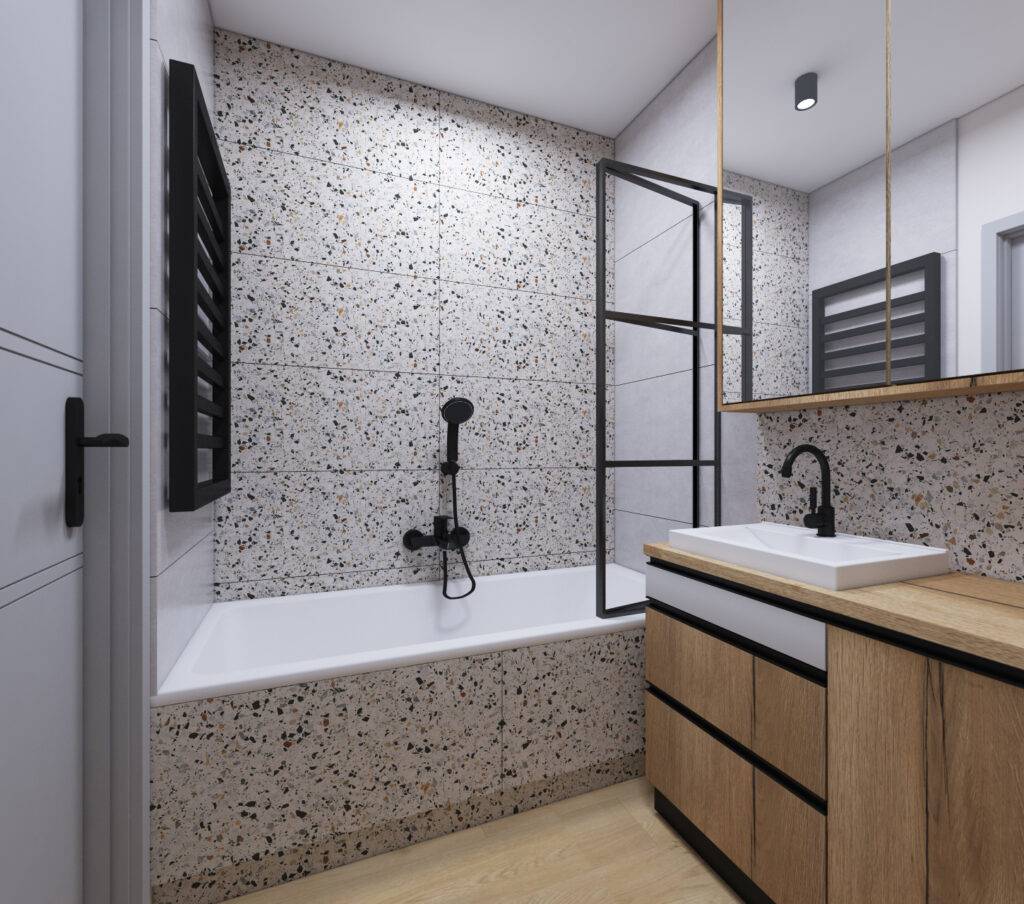 В средних и больших ванных комнатах цвет керамической плитки может быть практически любым. Интересно, что когда дело доходит до напольной плитки, цветовых вариантов гораздо меньше — зеленая плитка для ванной комнаты в оттенках глубокого изумруда или мяты все еще доступна. В случае последнего вы можете выбрать, например, черно-белую плитку для ванной и расположить их на полу в шахматном порядке.