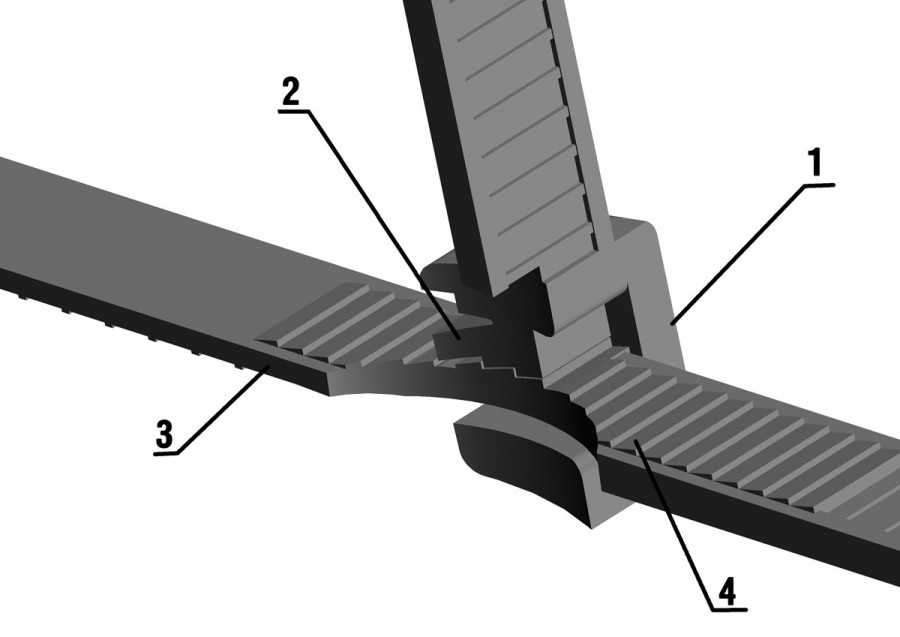 Замковый механизм в том случае, когда выходит из строя ломается вместе с. Именно присутствие встроенной головки нейлонового язычка – фиксатора блокирует обратный ход стяжки. Стоит разобрать детальнее устройство замка нейлоновых стяжек: