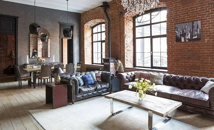 Лофт в квартире-студии часто сочетают с неоклассикой. Эклектические детали дополняют, но не вытесняют основное направление. Элегантные светильники, традиционные диваны и стулья выглядят эффектно на индустриальном фоне. Благодаря симметричной расстановке в помещении ощущается логическая завершенность.