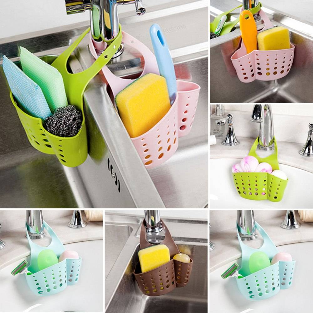 - Органайзеры на присосках — специальные сетчатые кармашки с присосками. Чаще всего такие приспособления размещают на внутренней поверхности кухонной раковины. Такой способ хранения помогает скрыть от посторонних глаз все средства для мытья посуды, поддерживать поверхность мойки чистой и сухой (вода с губки стекает непосредственно в сливное отверстие).