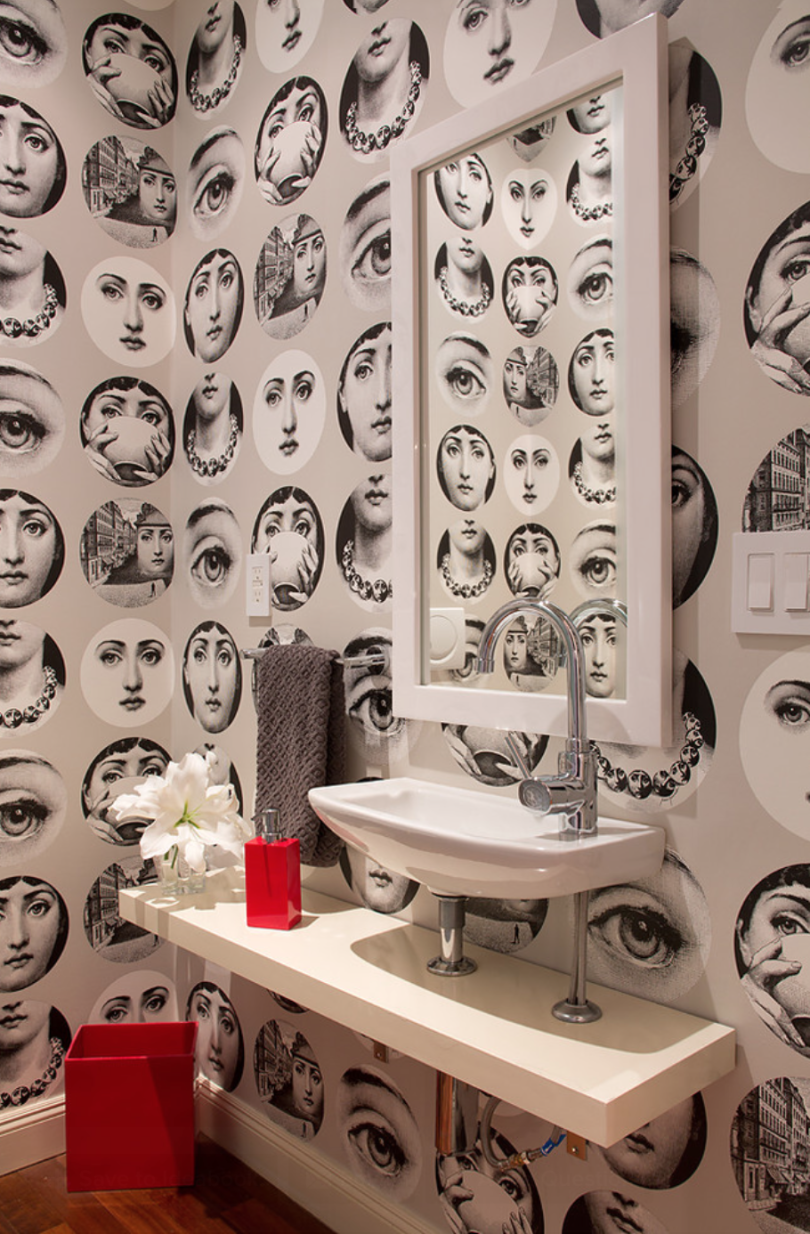 Если в ванной комнате установлена простая мебель и сантехника, имеется обычная ванна или душевая кабина, то можно рискнуть. Для этого многие домашние дизайнеры покупают моющиеся полотна с насыщенным и ярким рисунком. Это позволяет создать смелый, оригинальный, броский дизайн, который очень часто смотрится выигрышно.
