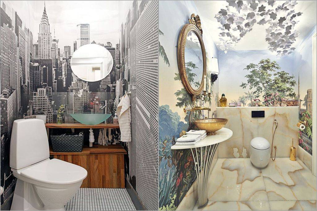Фотообои. Если вы креативный человек, любящий яркие и оригинальные акценты в дизайне, данный вид обоев для вас. Современные полотна с картинами имеют водоотталкивающие свойства, поэтому, поклеить их в санузле, не проблема. Вы можете выбрать обои с красивым крупным орнаментом, 3д изображениями, пейзажами, имитацией карты мира, фотографиями животных или насекомых, изображениями красивых растений и цветов, фигурных арок или сооружений и т.д.