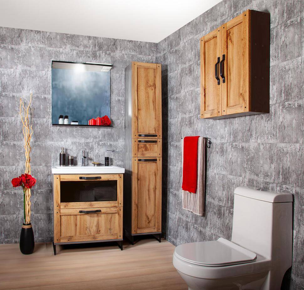 - Выбирайте шкафы и тумбы, которые изготавливаются именно для санузлов и отличаются повышенной влагостойкостью. Фасады такой мебели обязаны выдерживать постоянные изменения влажности и температуры, воздействие бытовой химии и т.д. Иначе лучше откажитесь от покупки некачественного предмета обстановки. Внимательно изучите стыки, фурнитуру, внутреннюю и внешнюю поверхности.