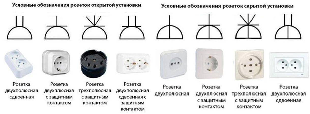 Условное обозначение розетки – полукруг. Количество и направление чёрточек, отходящих от него, показывают все параметры этих устройств: