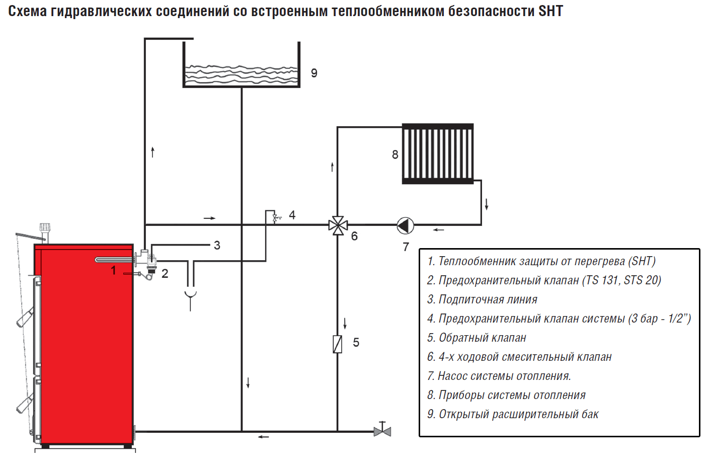 При обвязке твердотопливного котла сразу к нему следует подсоединять исключительно металлические трубы, а только через метр-полтора можно врезать полипропиленовые. Вдобавок к этому, надо предусмотреть резервный подвод холодной воды для аварийного охлаждения теплообменника, а также ее отвод в канализацию.