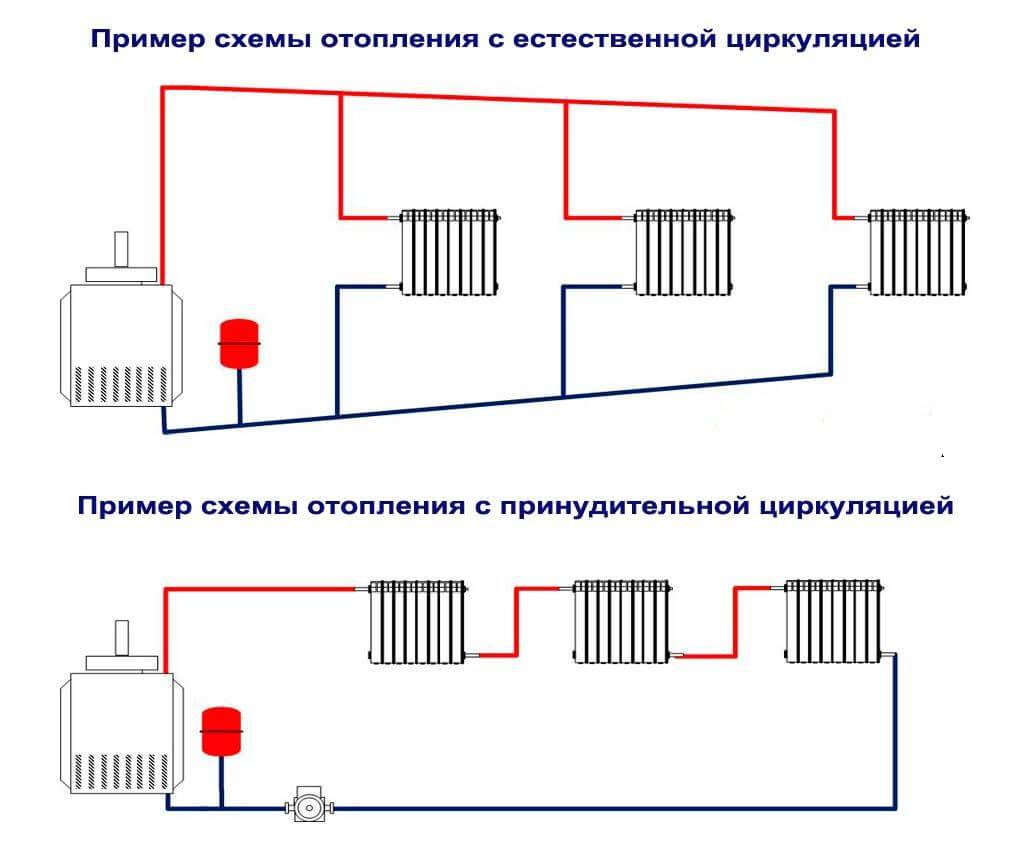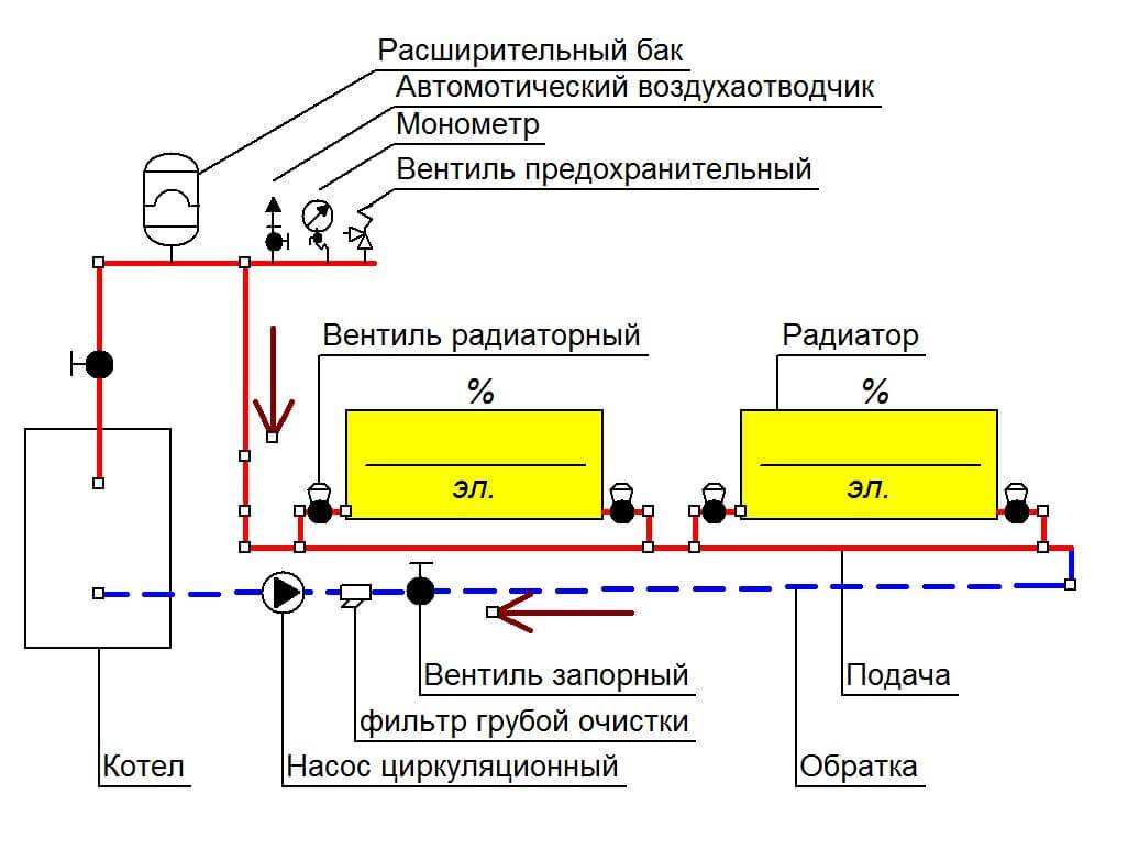 - Схема с циркуляционным насосом. Перемещение теплоносителя принудительное, работа системы более стабильная и эффективная. Такой вариант используется чаще всего.