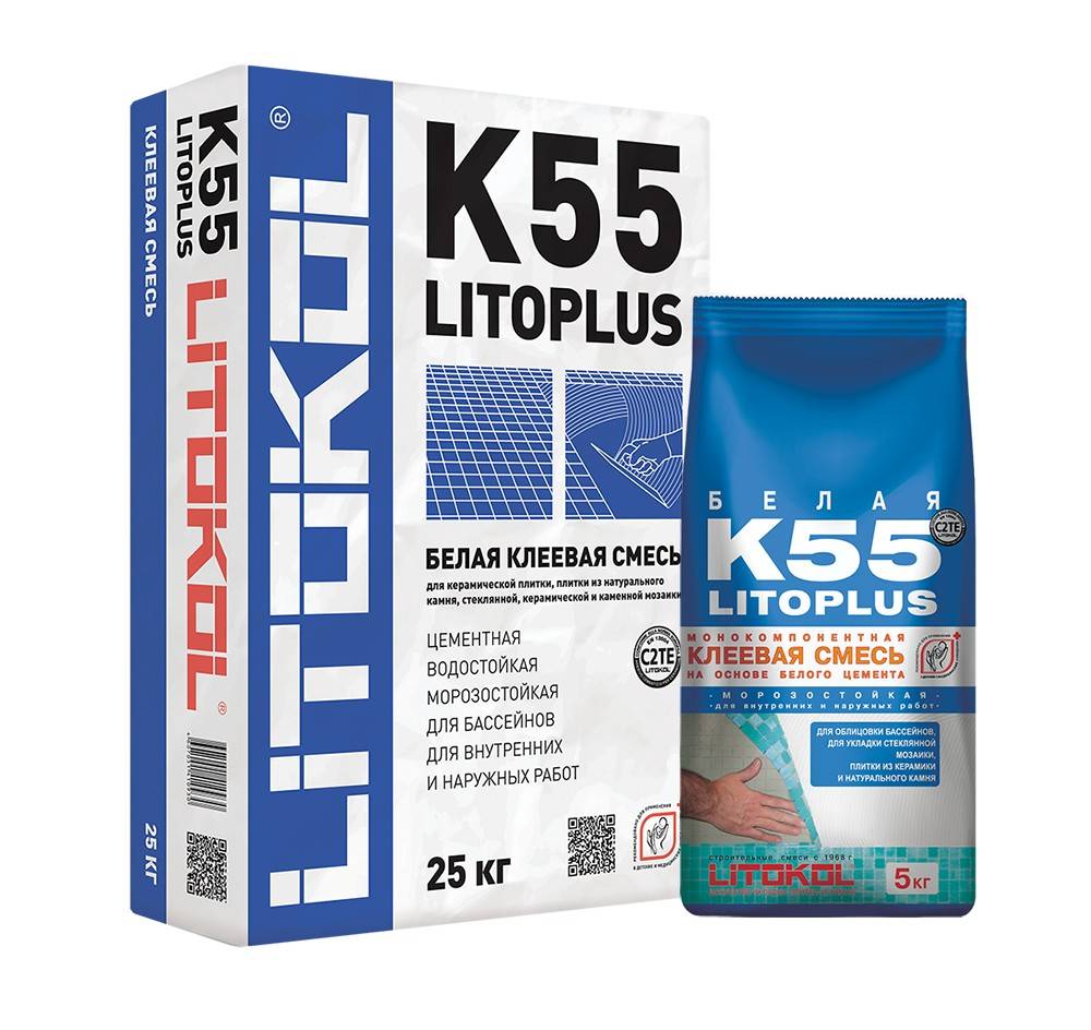 - Литоплюс К55 – клея для укладки мозаичной плитки на пол на основе белого цемента. Материал предназначен для работ в помещениях с повышенной влажностью – в ванных, бассейнах, душевых;