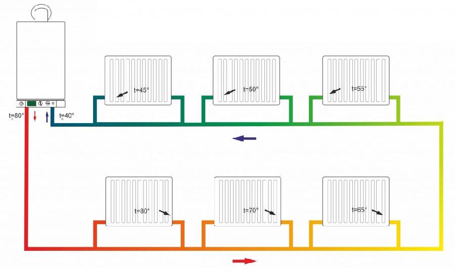 - В результате каждая последующая батарея получает теплоноситель с более низкой температурой. В конце остывшая вода направляется обратно в котел по той же магистрали.