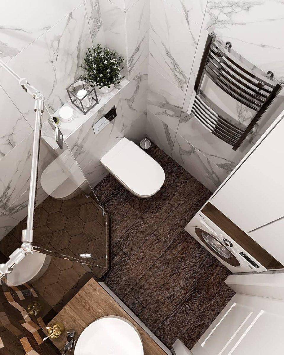 Дизайн ванной комнаты в форме квадрата со стиральной машиной предполагает использование душевой кабины вместо привычной ёмкости для купания. Это позволит сохранить больше свободного места. В таком помещении поместится унитаз, большая душевая, раковина, стиральный агрегат или узкий шкаф.