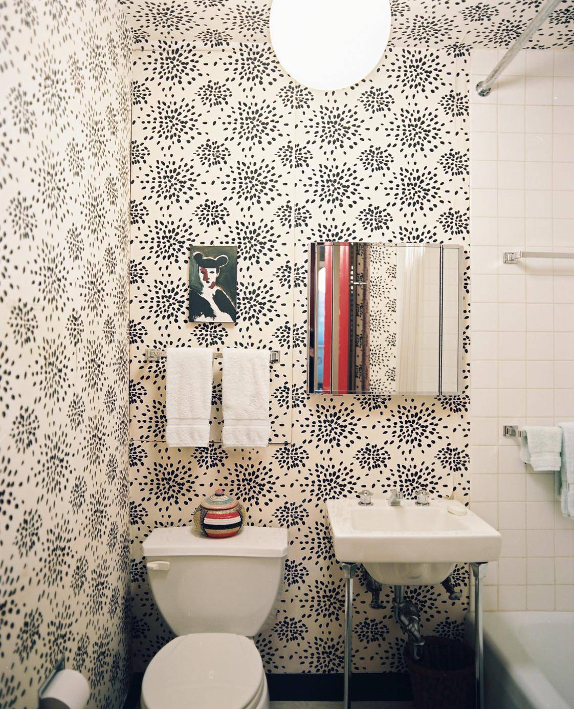 Черно-белые обои с мелким узором в ванной комнате