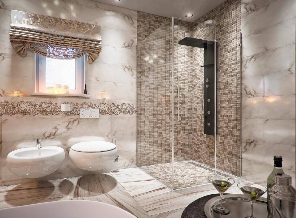 Другой интересной идеей выглядит вставка маленьких мозаичных частиц в крупную кафельную плитку. Не стоит забывать и о совмещении кафельной плитки с узкими бордюрами (это позволит разделить комнату на отдельные зоны).